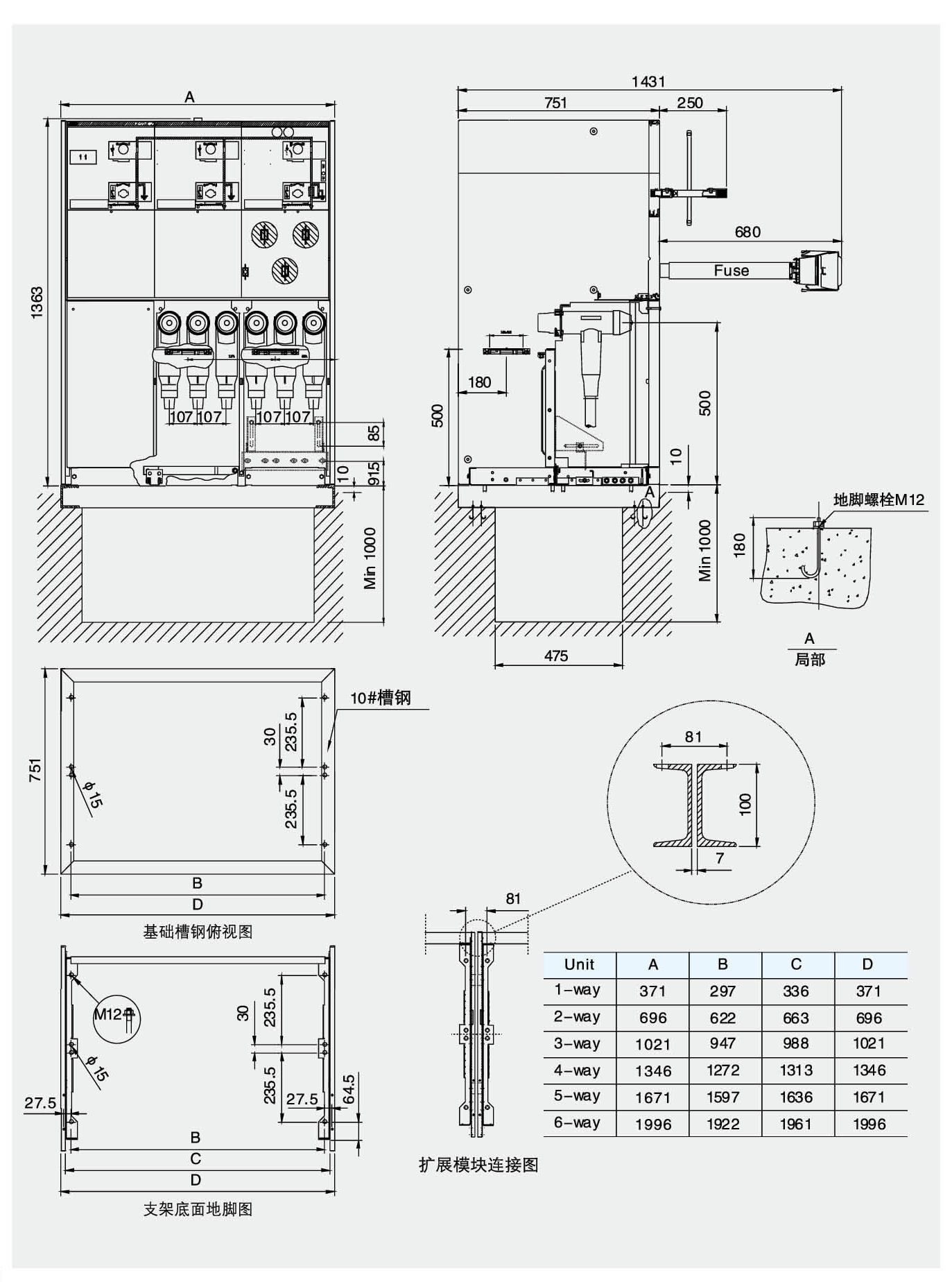 SRM6-12系列充气式开关柜安装在一个镀锌板框架上,开关单元在SF6气箱内,气箱由抗腐蚀和无磁性3mm厚不锈钢板制成。SF6气箱是一个“密封压力系统”在正常工作环境下可运行20年。SF6气体正常工作时压力为0.15~0.4br。气箱装有压力释放装置,当压力过高时,保证气体能从底部或后部释放。